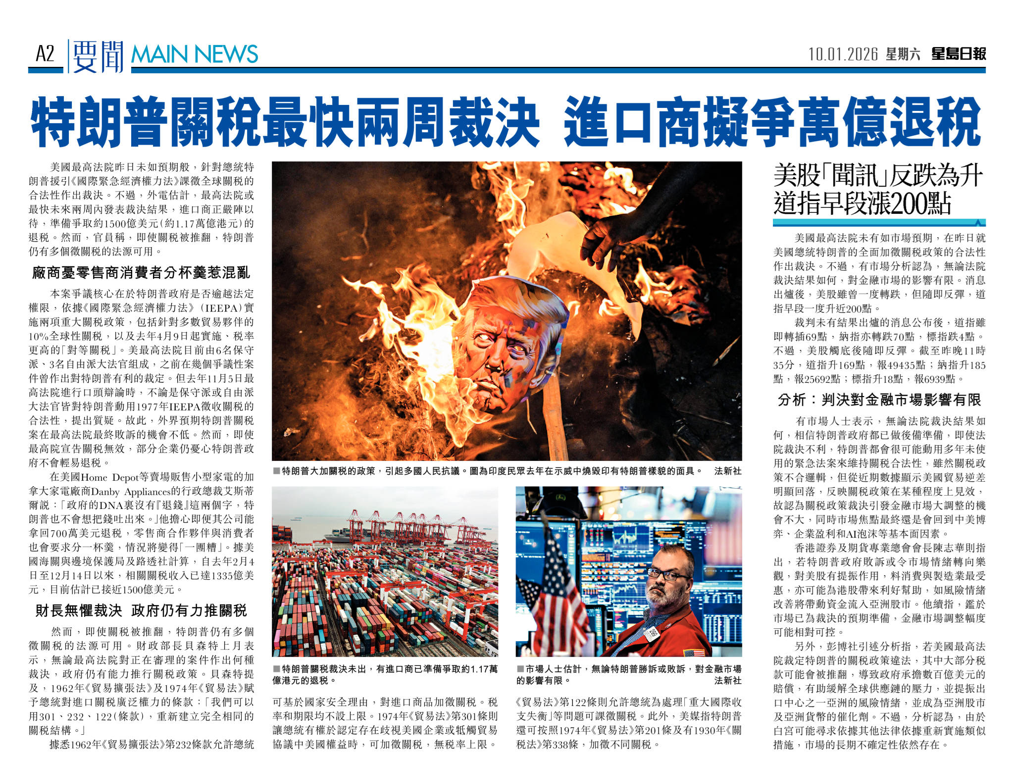 2026-01-10 星島日報 特朗普關稅最快兩周裁決 進口商擬爭萬億退稅 (相片)