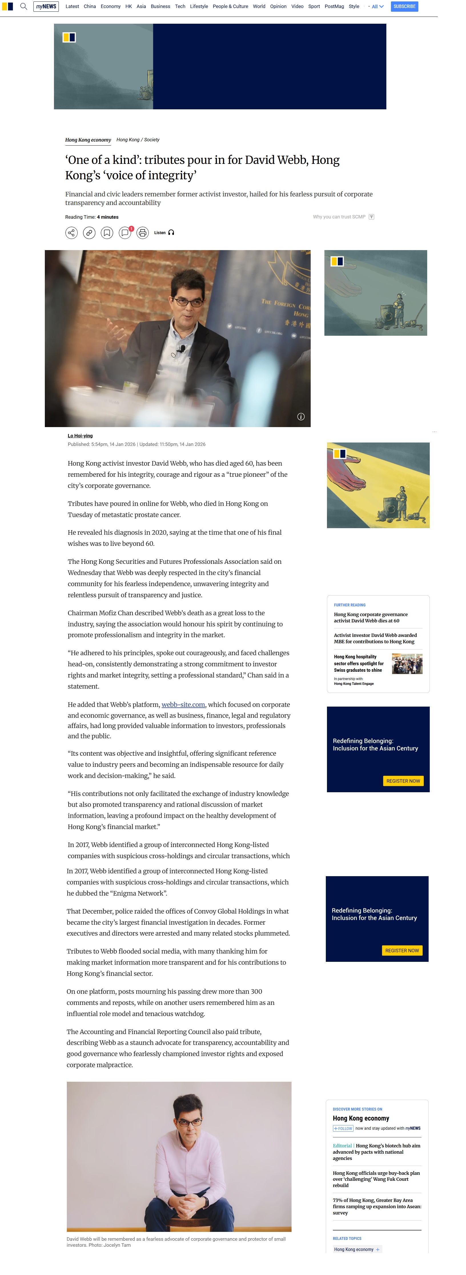 2026-01-14 SCMP ‘One of a kind’: tributes pour in for David Webb, Hong Kong’s ‘voice of integrity’ (Photo)