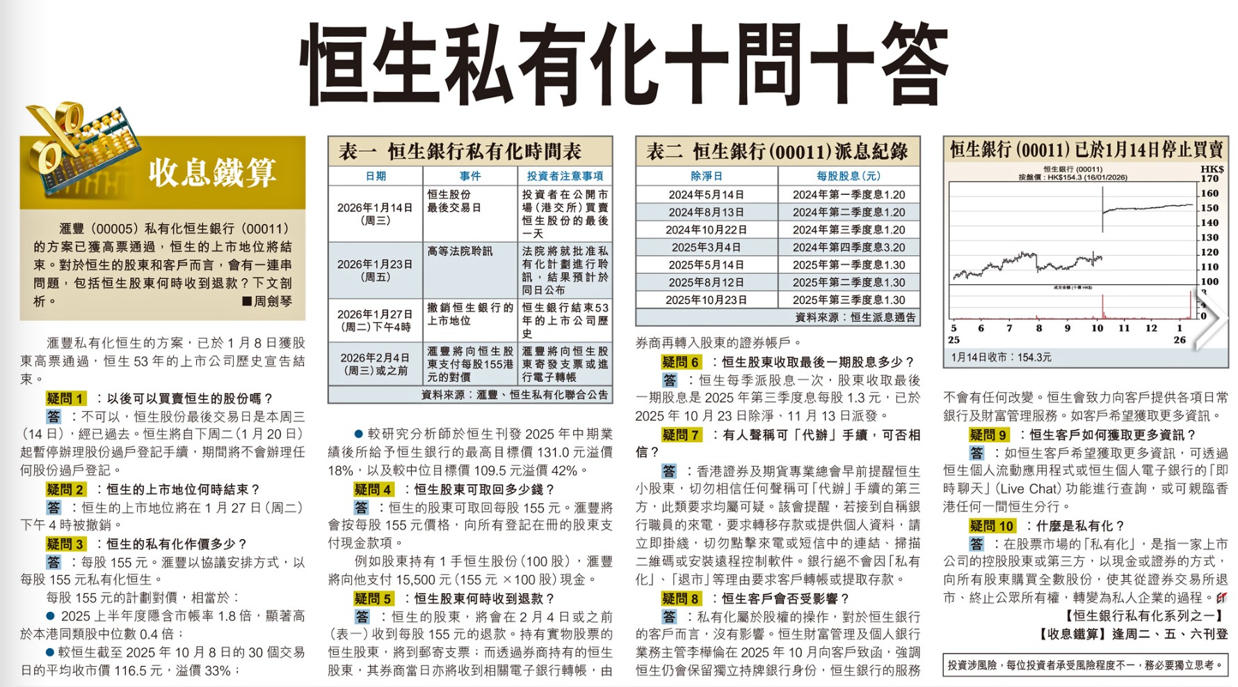 2026-01-14 經濟日報 恒生私有化|揸恒生實物股票 坐著等收錢? (相片)