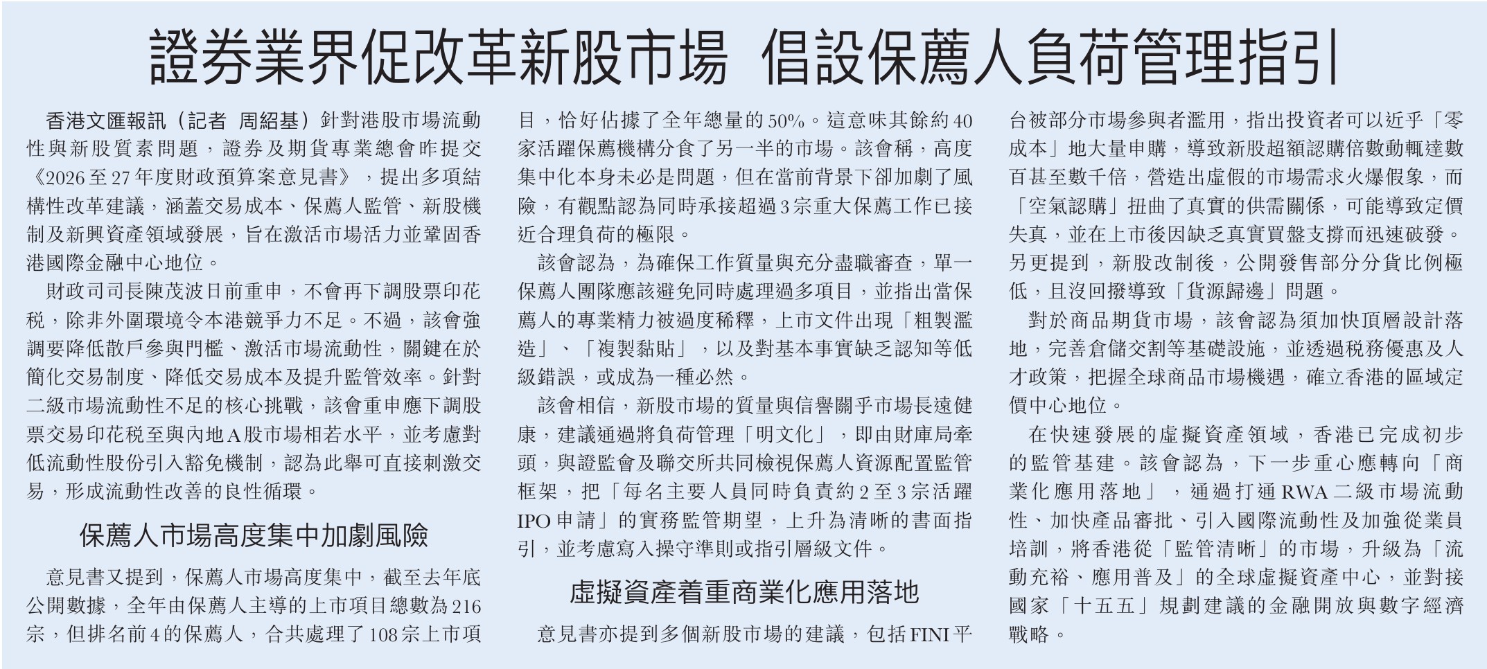 2026-01-20 文匯報 證券業界促改革新股市場 倡設保薦人負荷管理指引 (相片)
