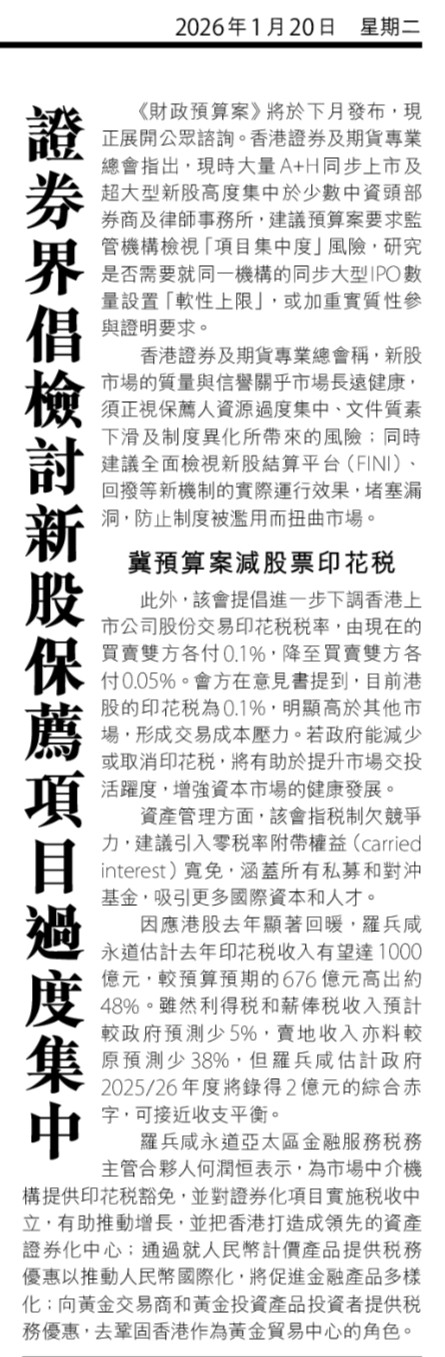 2026-01-19 經濟通 【預算前瞻】證券及期貨專業總會:對於IPO派貨機制,建議提高散戶配發比例 (相片)