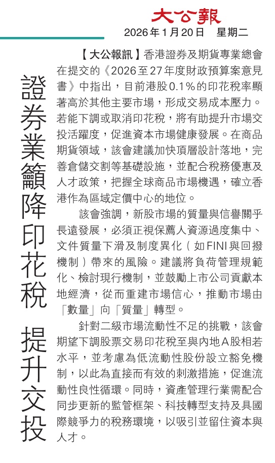 2026-01-20 大公報 證券業籲降印花稅 提升交投 (相片)