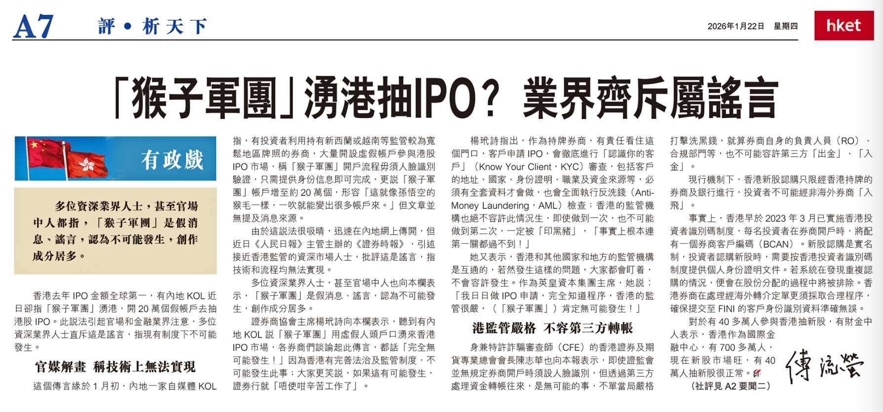 2026-01-22 經濟日報 「猴子軍團」湧港抽IPO? 業界齊斥屬謠言 (相片)