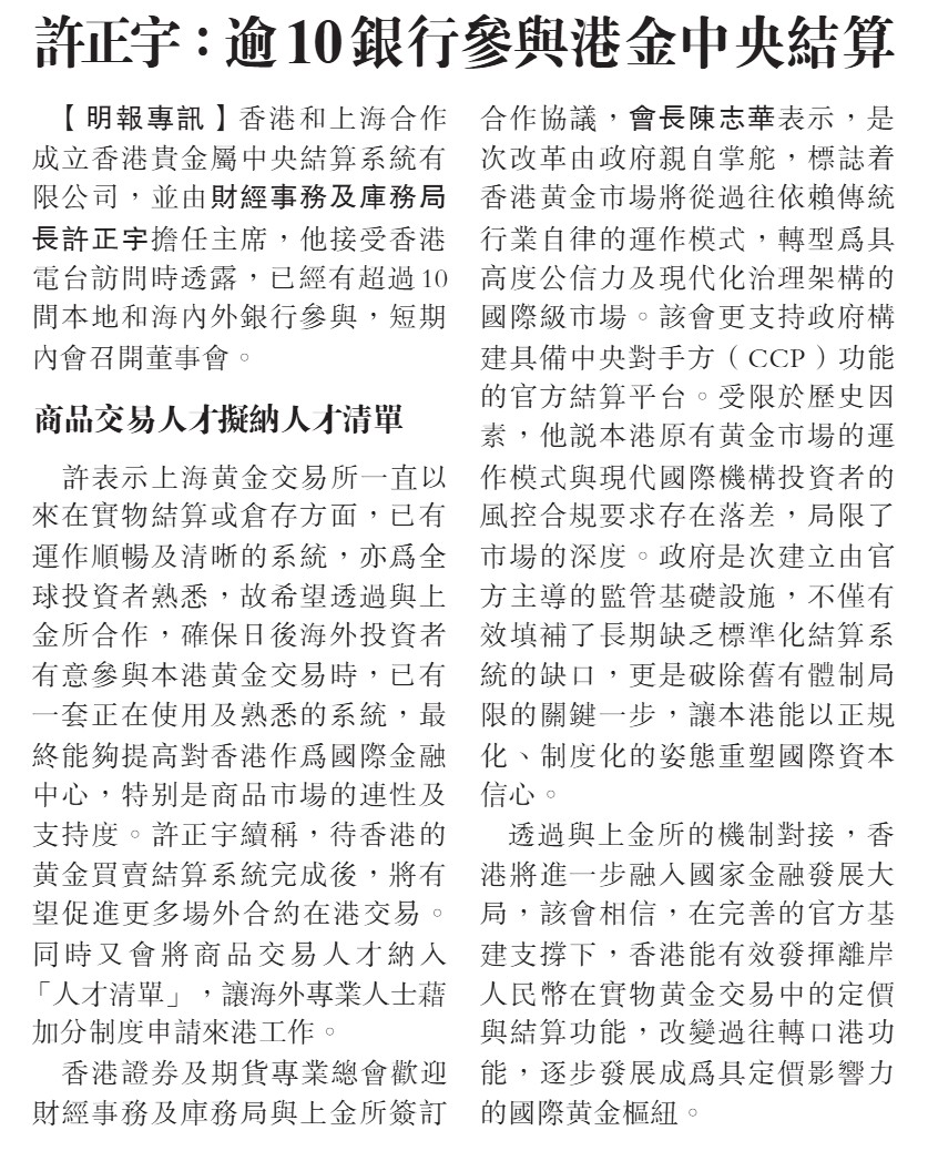 2026-01-28 明報 許正宇:逾10銀行參與港金中央結算 (相片)