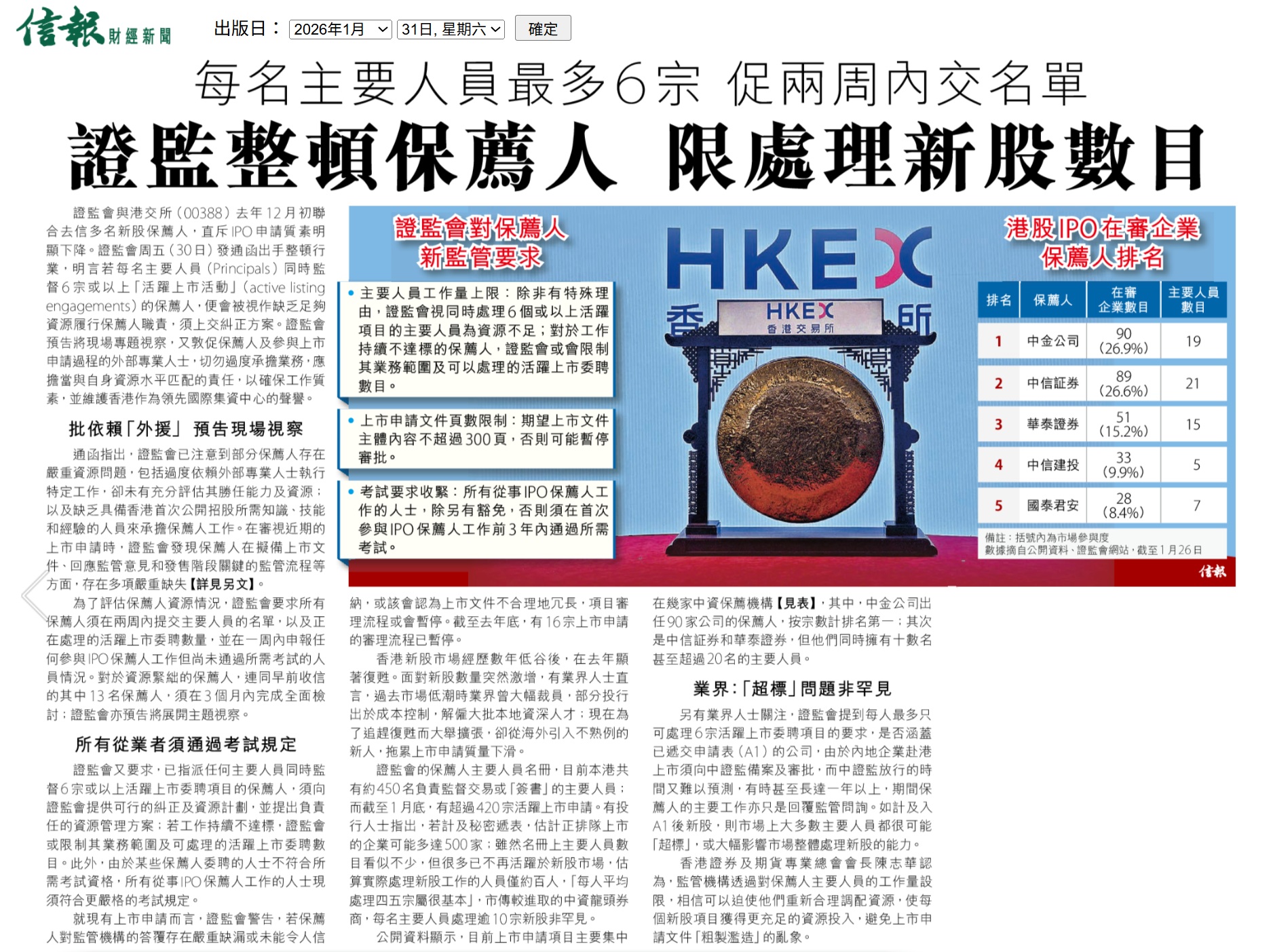 2026-01-31 橙新聞 侯思明|從保薦人視角看現今「速成」文化的危害 (相片)2026-01-31 文匯報 業界四建議 促港提升保薦新股質量 (相片)
