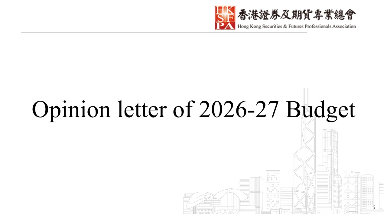 This submission provides comprehensive recommendations for the 2026-27 Budget, focusing on the spot market, commodity futures market, IPO market, secondary market liquidity, asset management, virtual assets, and investor protection (including safeguarding elderly assets and collective litigation mechanisms). We believe systematic and pragmatic reforms can address market participants' needs, capitalise on strategic opportunities presented by the National 15th Five-Year Plan, and strengthen Hong Kong's unique advantages under “One Country, Two Systems.”