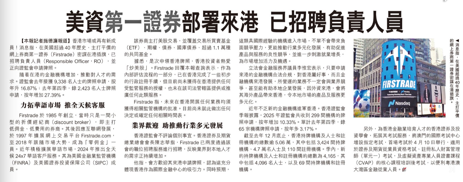 2026-03-23 經濟日報 美資第一證券部署來港 已招聘負責人員 (相片)
