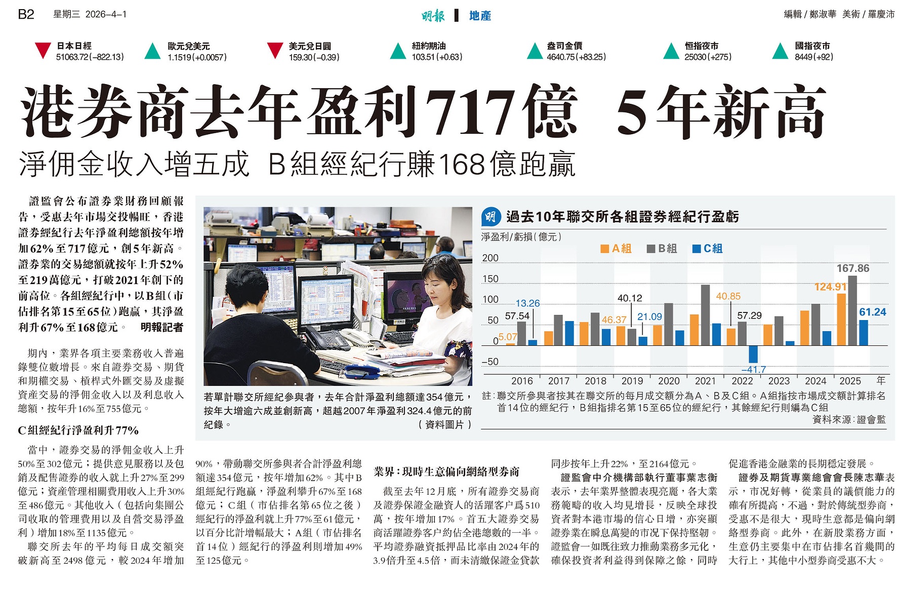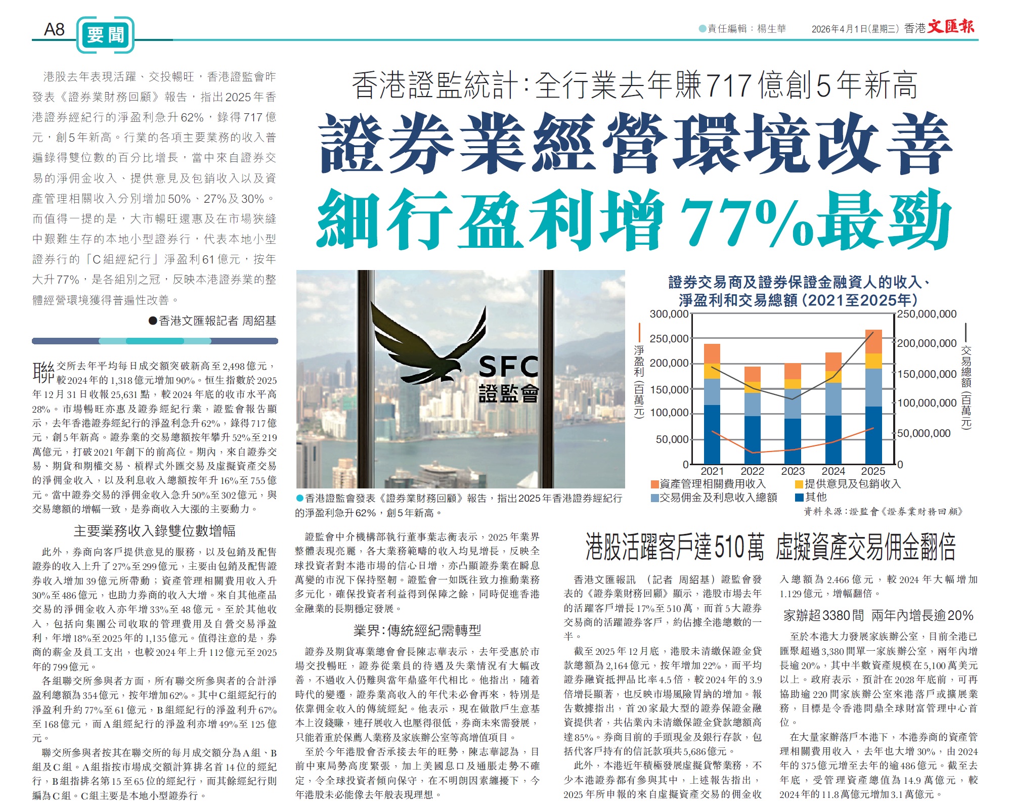 2026-04-01 文匯報 香港證監統計:全行業去年賺717億創5年新高 證券業經營環境改善 細行盈利增77%最勁 (相片)2026-04-01 明報 港券商去年盈利717億 5年新高 淨佣金收入增五成 B組經紀行賺168億跑贏 (相片)