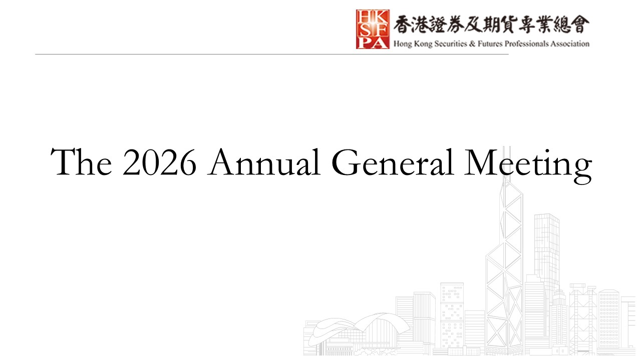 The 2026 Annual General Meeting of the Hong Kong Securities and Futures Professionals Association has been resolved by the Council to be held on Monday, 4 May 2026 at 3:00 p.m. at the Association’s premises: 1/F, Siu Ying Commercial Building, 151-155 Queen's Road Central, Central, Hong Kong.Resolutions proposed at the Annual General Meeting shall be valid if passed by a simple majority of the attending voting members or their proxies. Members are cordially invited to attend and participate. For details, please refer to the documents relating to the 2026 Annual General Meeting. The 2026 Annual General Meeting Agenda is attached for your reference. Please bring your valid membership card for admission.