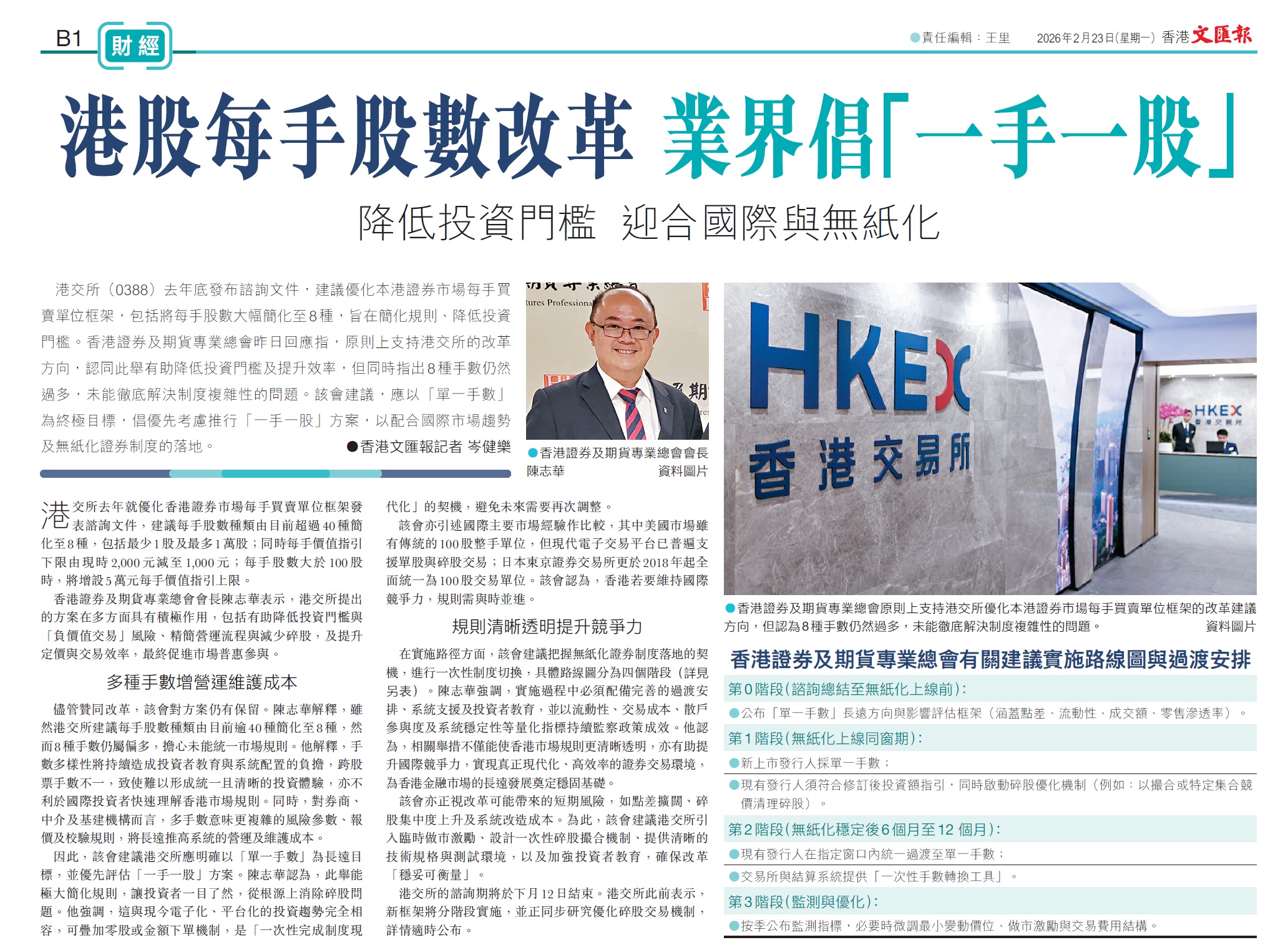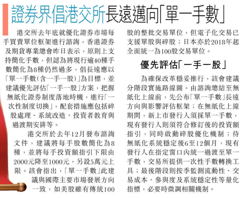 2026-02-23 文汇报 港股每手股数改革 业界倡「一手一股」 降低投资门槛 迎合国际与无纸化 (相片)