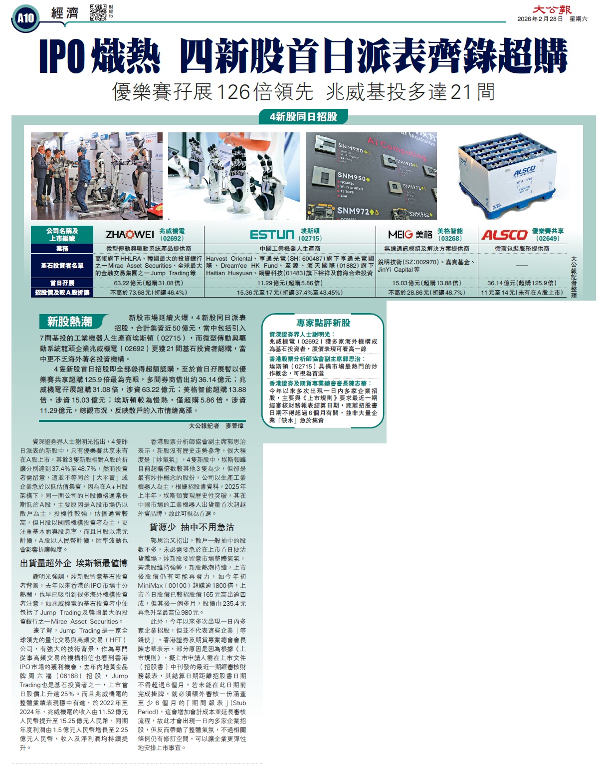 2026-02-28 大公报 新股热潮/IPO炽热 四新股首日派表齐录超购 (相片)