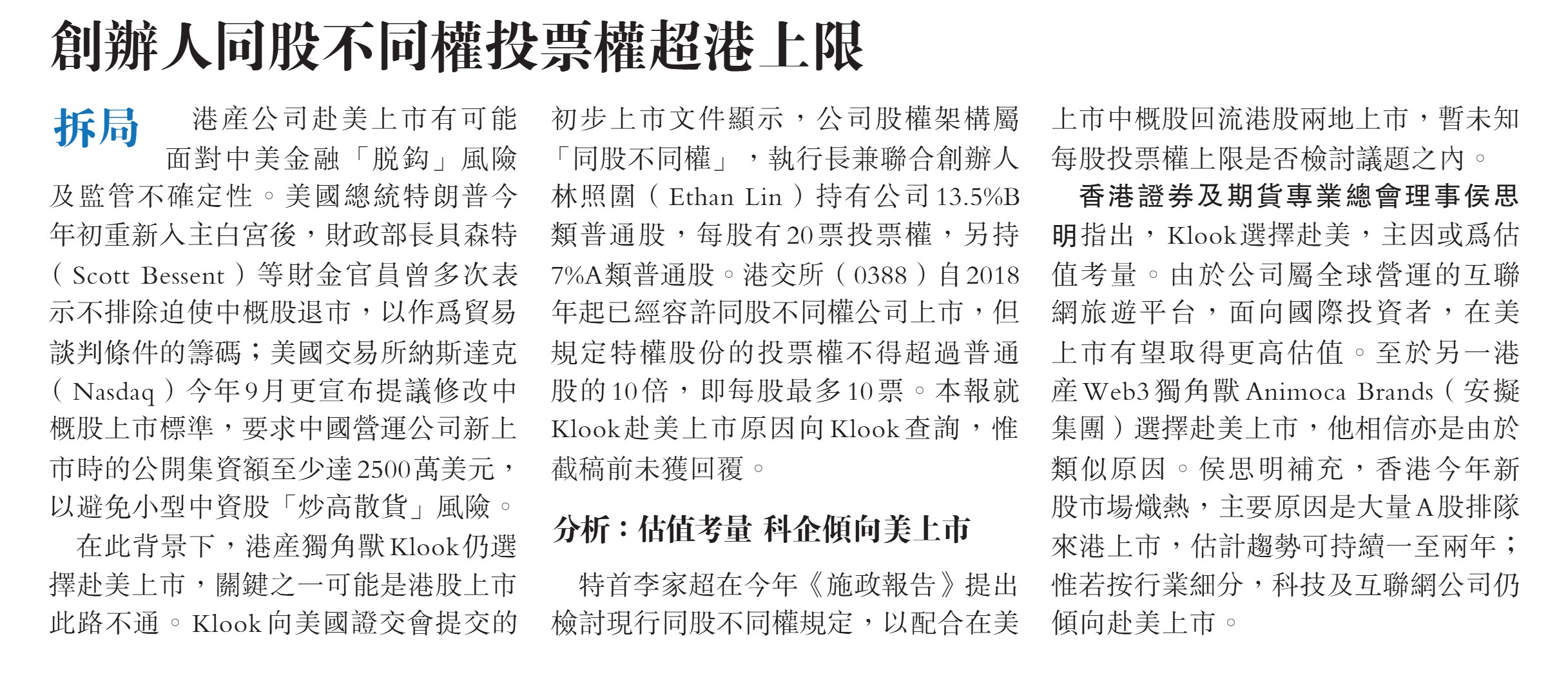 2025-11-12 明報 創辦人同股不同權投票權超港上限 (相片)