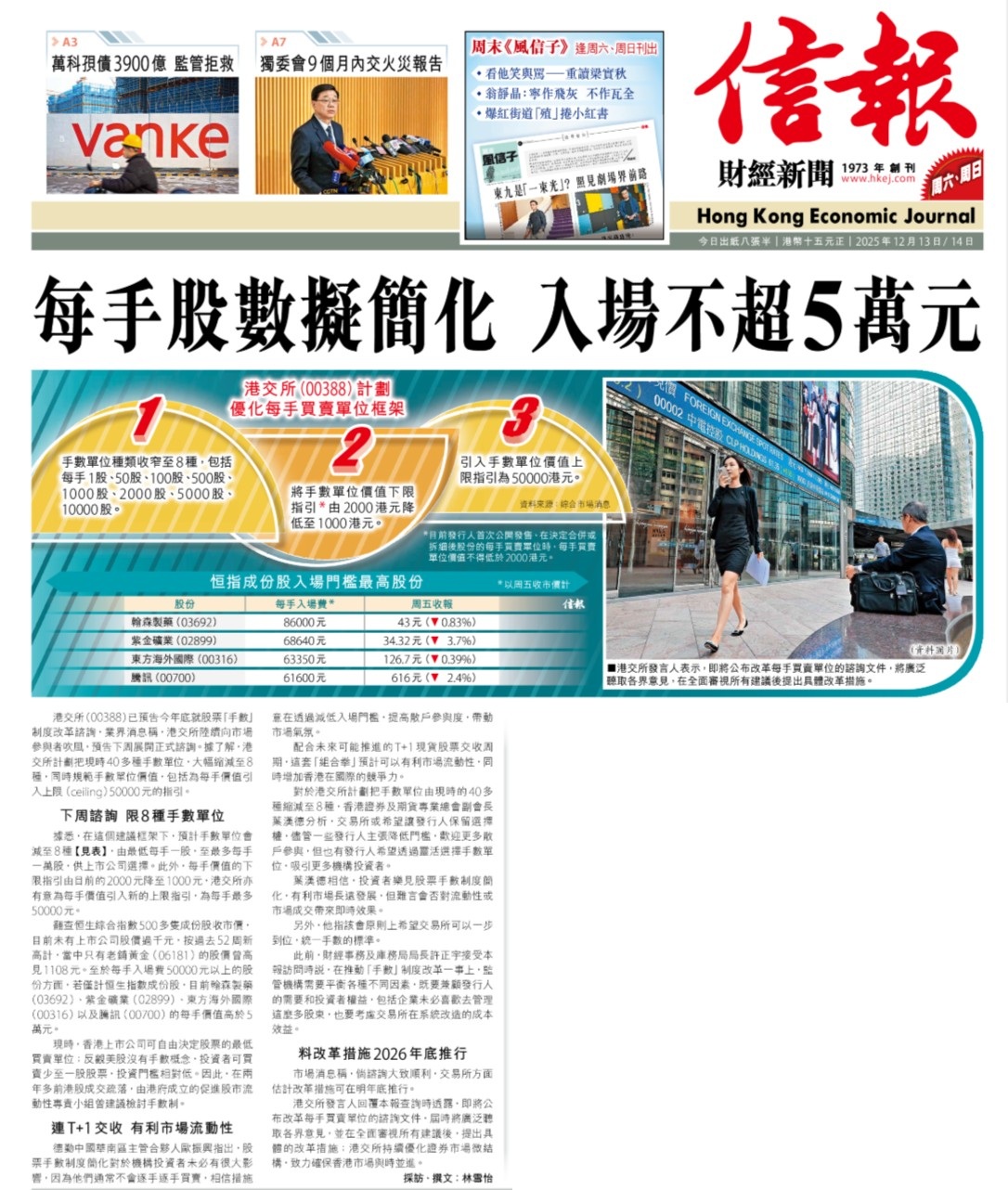 2025-12-13 信報 每手股數擬簡化 入場不超5萬元 (相片)2025-12-13 經濟日報 港交所倡交易手數降至8種 每手最低減至1千元 (相片)
